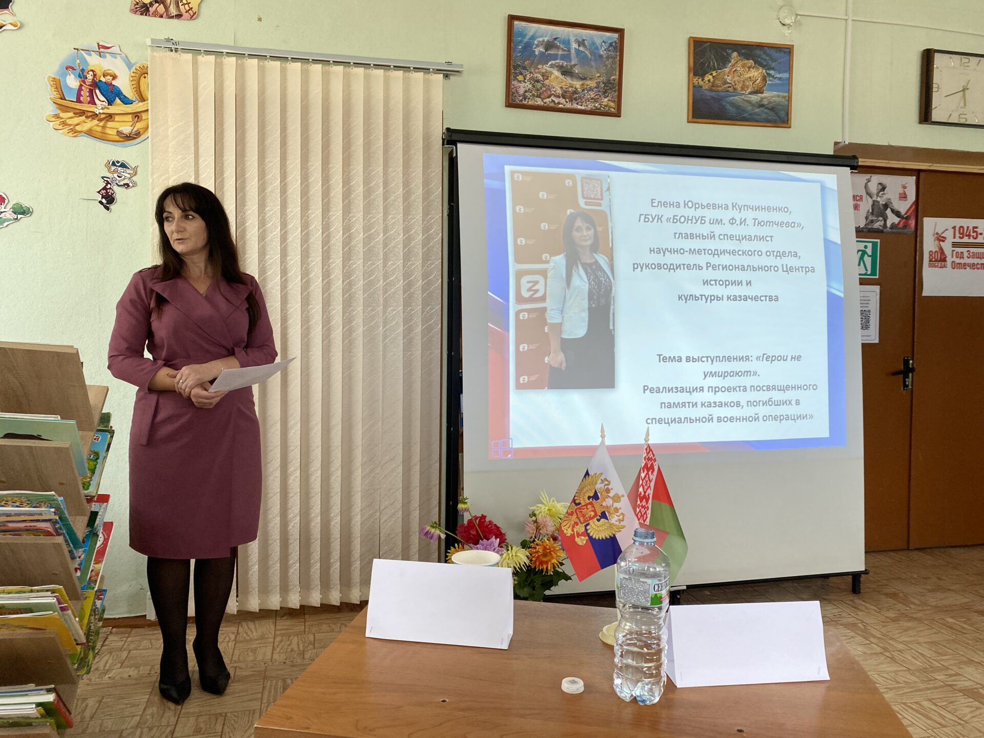 Областную библиотеку представляла Елена Купчиненко, руководитель Регионального Центра истории и культуры казачества, которая познакомила с проектом «Герои не умирают», посвященным памяти казаков, погибших в СВО. Елена Малахова, методист БОНУБ поделилась опытом работы по продвижению чтения для детей и подростков.