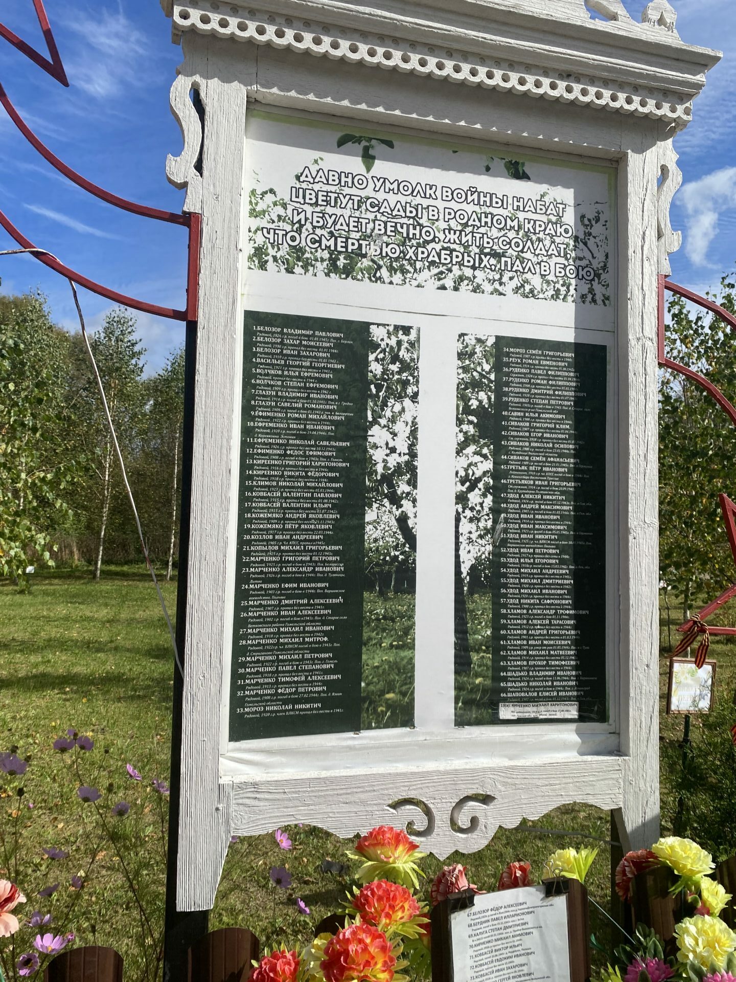В честь погибших на войне солдат она высадила аллею из более 60 саженцев берез. Это было в 2020 году. За 5 лет березы подросли, а в начале аллеи появился стенд в форме окна, где под номерами записаны все погибшие на фронтах Великой Отечественной. У берез тоже есть номера. Почему взято окно? Потому что все женщины села в годы войны с надеждой смотрели в окно, мечтая увидеть возвращавшегося с фронта мужа, сына, брата.