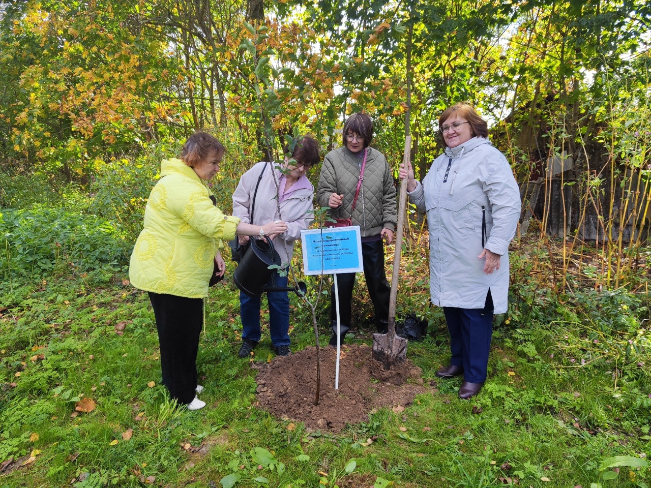 Вторая аллея в указанном саду – это высаженные яблони в честь вернувшихся с фронта земляков и тружеников тыла. Каждая яблоня имеет табличку с именем ветерана. Отведено место и для тех, кто посещает Сад памяти и желает посадить свое дерево. Что мы и сделали. Библиотекари посадили яблоньку, которая со временем принесет вкусные плоды.