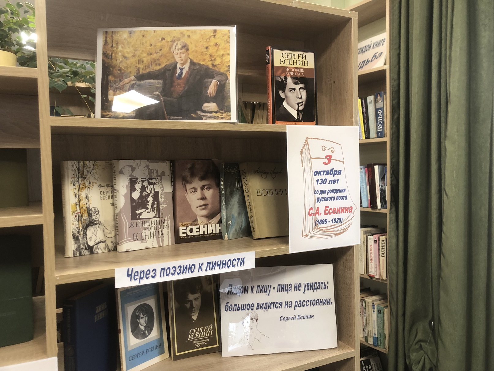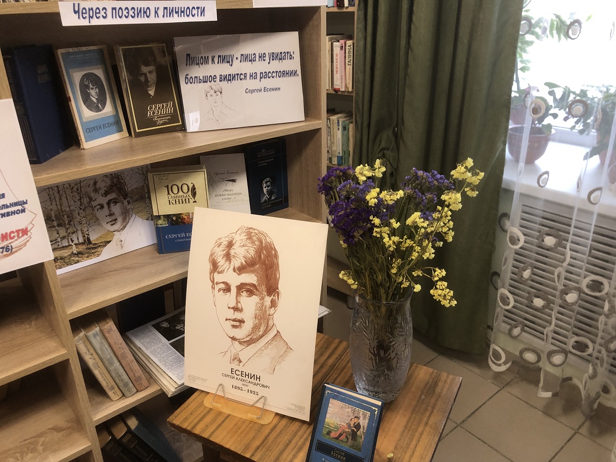 В честь юбилея великого русского поэта отдел обслуживания Климовской центральной библиотеки подготовил книжно-журнальную выставку «Судьба и лира Сергея Есенина». Выставка включает избранные сочинения поэта, литературоведческие исследования биографии и творчества Есенина, а также воспоминания его современников и родных.