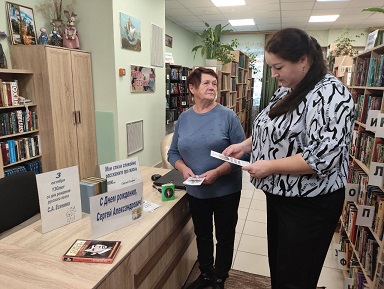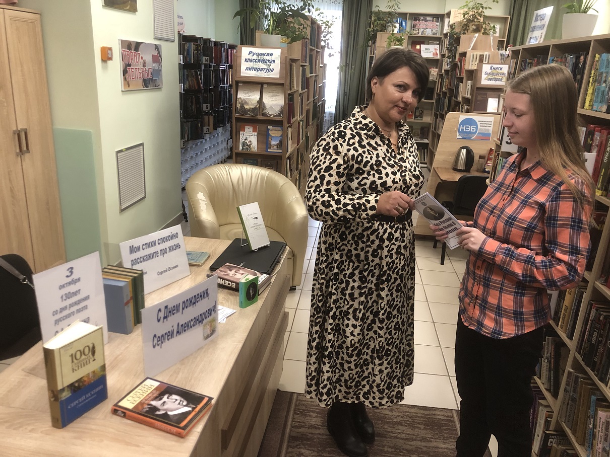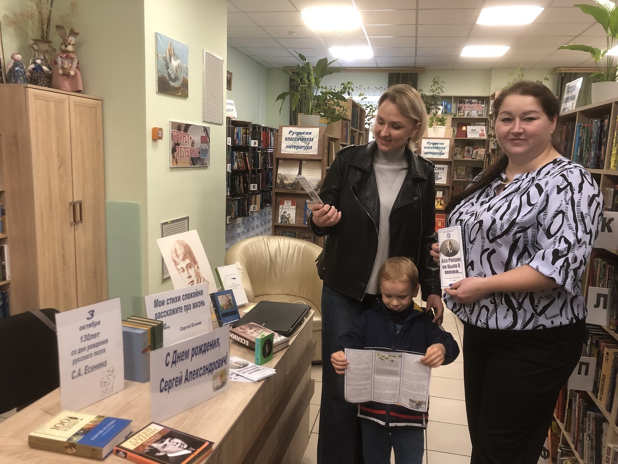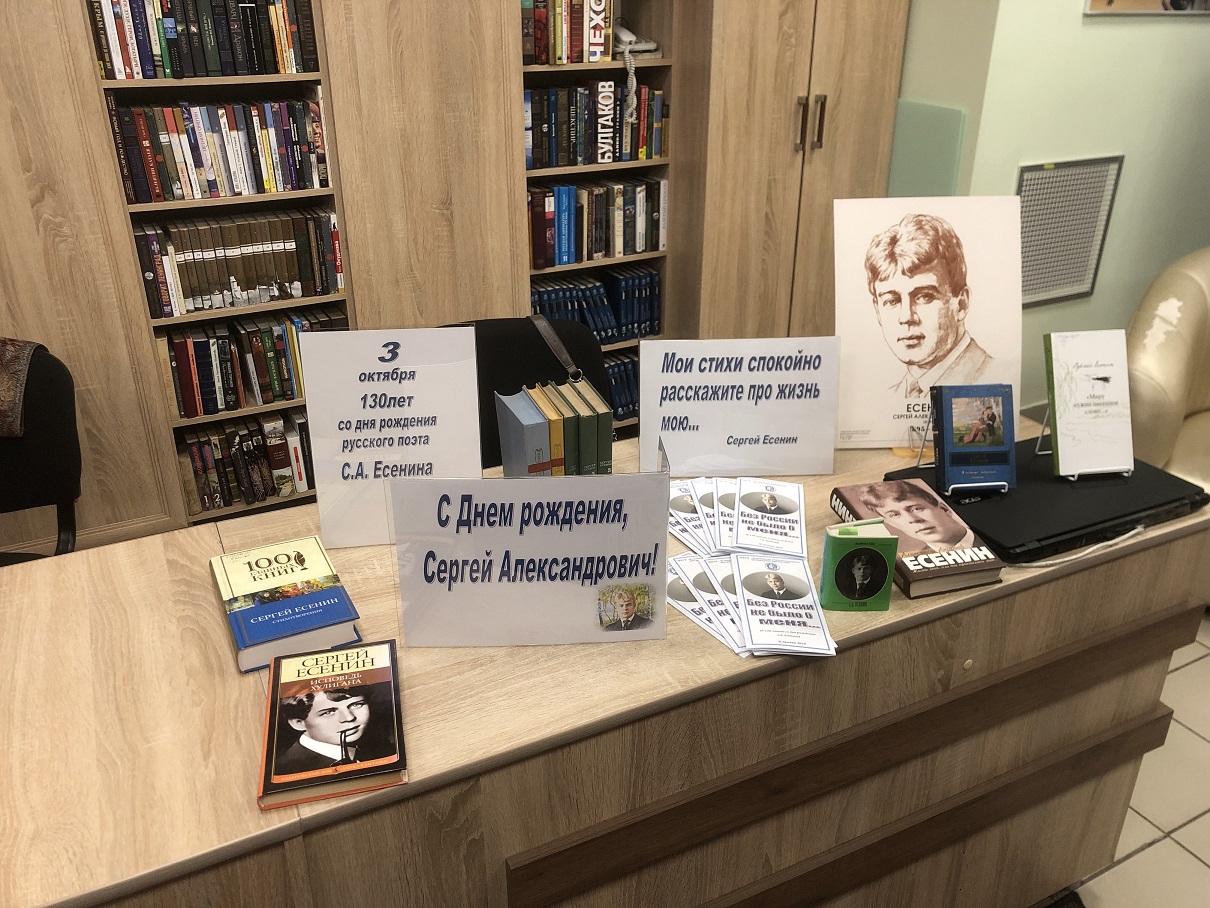 В честь юбилея писателя подготовлена и проведена литературная акция «С днем рождения, Сергей Александрович!», в рамках которой читателям библиотеки предлагалось вспомнить стихи Есенина, интересные факты его биографии, взять с собой сборник стихов поэта. Читатели участвовали в викторине «Знакомый ваш, Сергей Есенин» а библиотекари подготовили и дарили читателям литературные буклеты «Без России не было б меня…» со стихами Сергея Есенина.