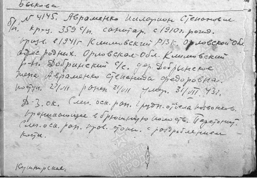 Авраменко Илларион Степанович23.10.2025 Просмотров: 12 Авраменко Илларион СтепановичУроженец с. Крапивное 1910 года рождения, русский. Призван Климовским РВК, 359сп,289 ЭГ. рядовой. Умер от ран 31.09.1943г. Похоронен: г. Кантемировка Воронежской обл. Челховское сельское поселение