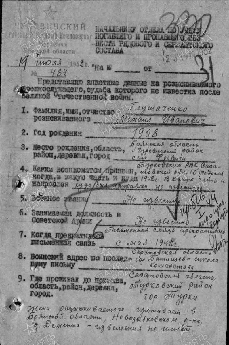 Глушаченко Михаил Иванович24.10.2025 Просмотров: 9 Глушаченко Михаил ИвановичУроженец с.Фоевичи1908 года рождения русский . Призван Климовским. РВК, рядовой. Пропал без вести 01.1944г. Челховское сельское поселение