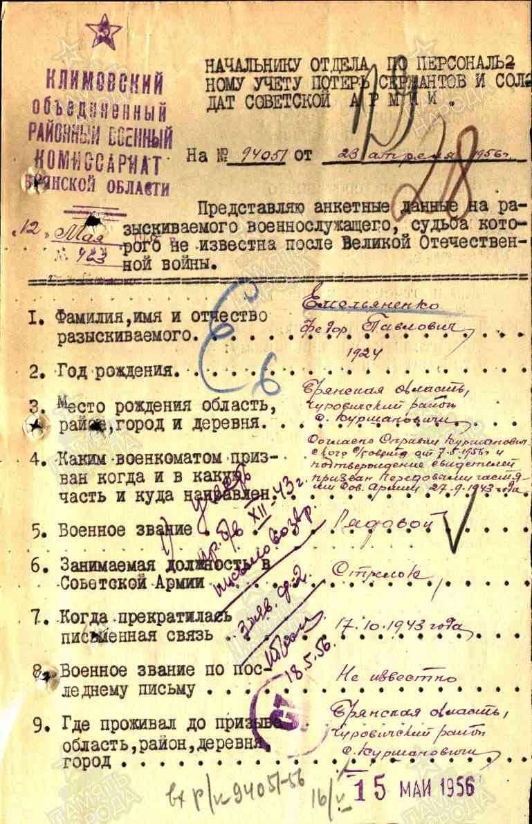 Емельяненко Федор Павлович27.10.2025 Просмотров: 17 Емельяненко Федор ПавловичУроженец с. Куршановичи 1924 года рождения русский. Призван Климовским РВК , рядовой. Погиб в бою 12.1943г. Челховское сельское поселение