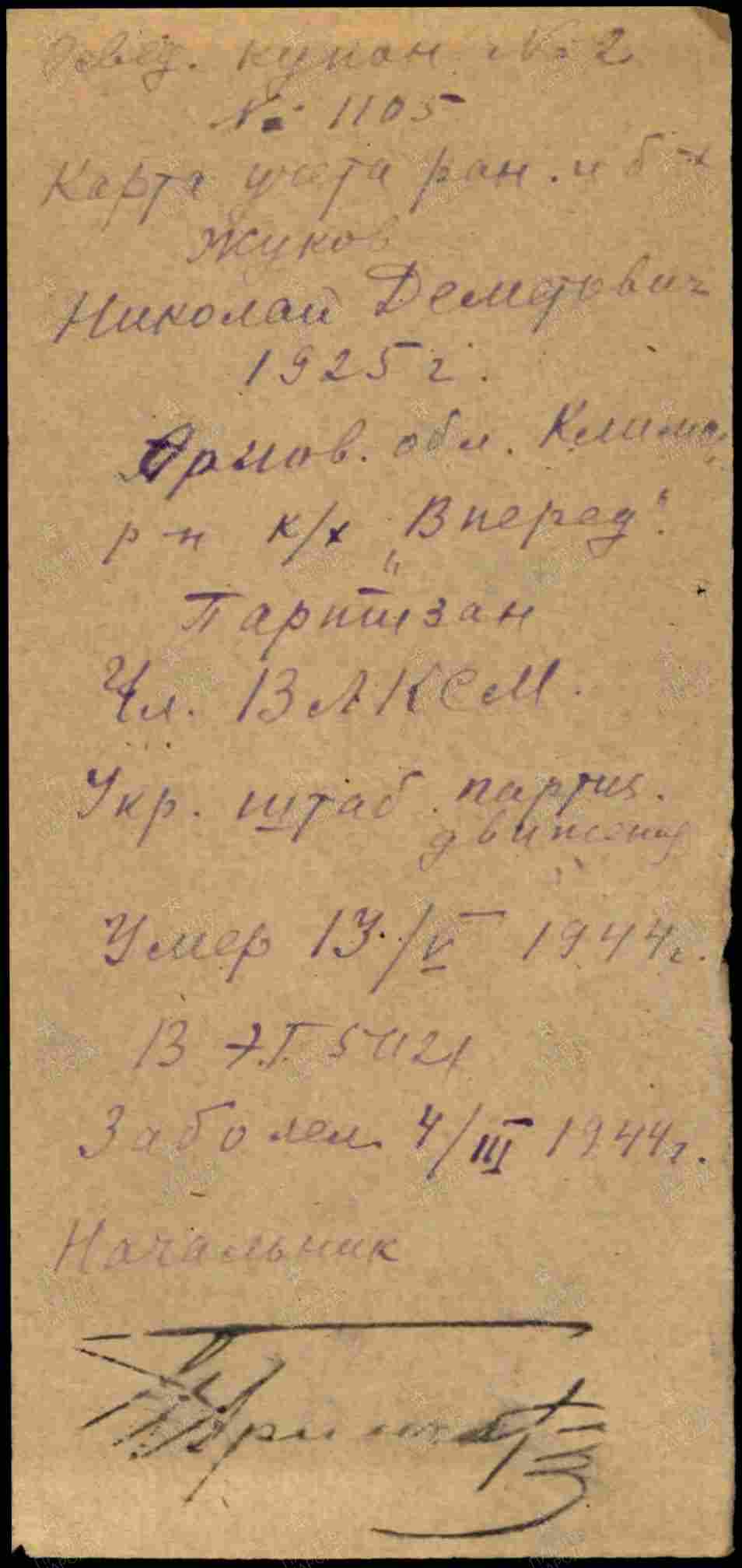 Жуков Николай Даметович27.10.2025 Просмотров: 12 Жуков Николай ДаметовичУроженец с. Куршановичи 1906 года рождения русский . Призван Климовским. РВК, 5021 ЭГ, партизан (Украинский штаб партизанского движения). Умер от ран 13.05.1944г. Похоронен: г. Москва Челховское сельское поселение