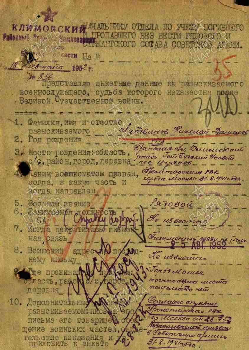 Литвинов Николай Данилович10.11.2025 Просмотров: 6 Литвинов Николай ДаниловичУроженец с. Гетманская Буда 1918 года рождения, русский. Призван Климовским РВК , рядовой. Пропал без вести01.12.1943г. Челховское сельское поселение