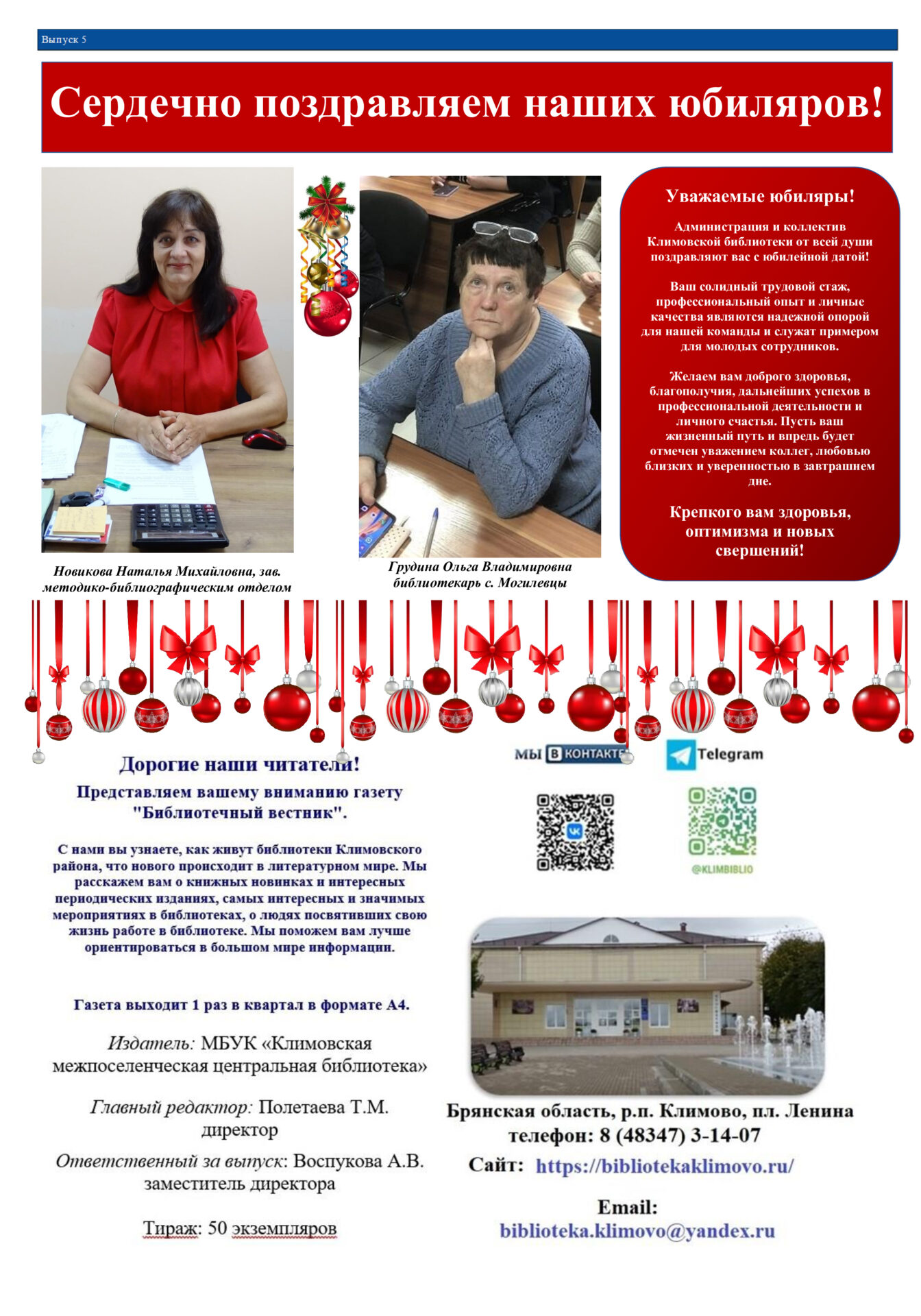 Муниципальное бюджетное учреждение культуры "Климовская межпоселенческая центральная библиотека" (МБУК "КМЦБ") 243040 Брянская обл., Климовский р-н, р.п. Климово, пл. Ленина,д.2; тел.:8(48347) 3-14-07; E-mail: biblioteka.klimovo@yandex.ru'