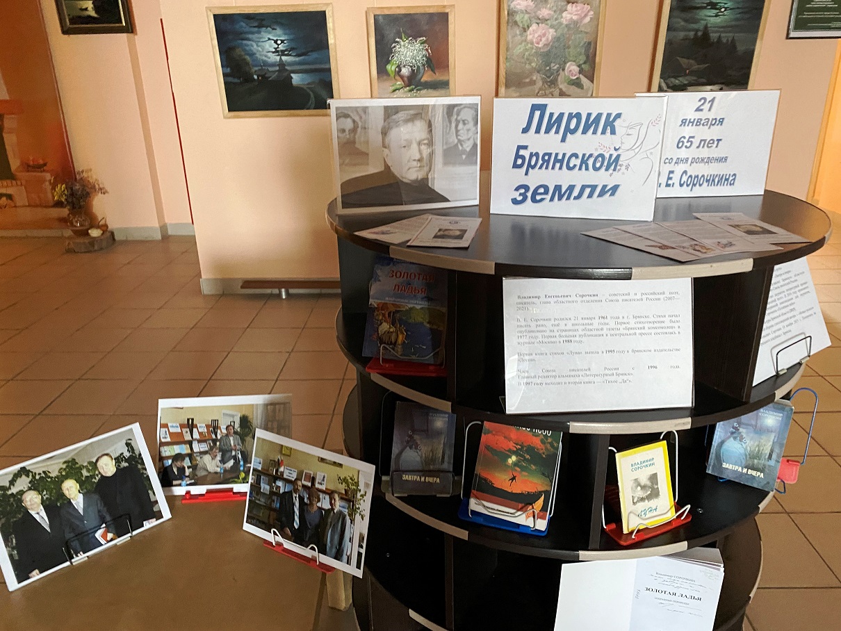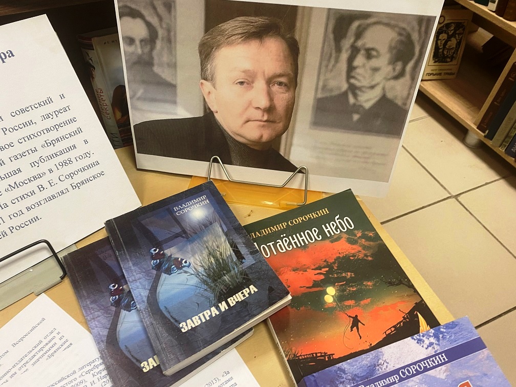 В эти морозные январские дни исполняется 65 лет Владимиру Сорочкину. В Климовской библиотеке оформлена выставка, посвященная его творчеству “Лирик Брянской земли”. На выставке представлены книги Владимира Сорочкина, статьи о нем, фото.