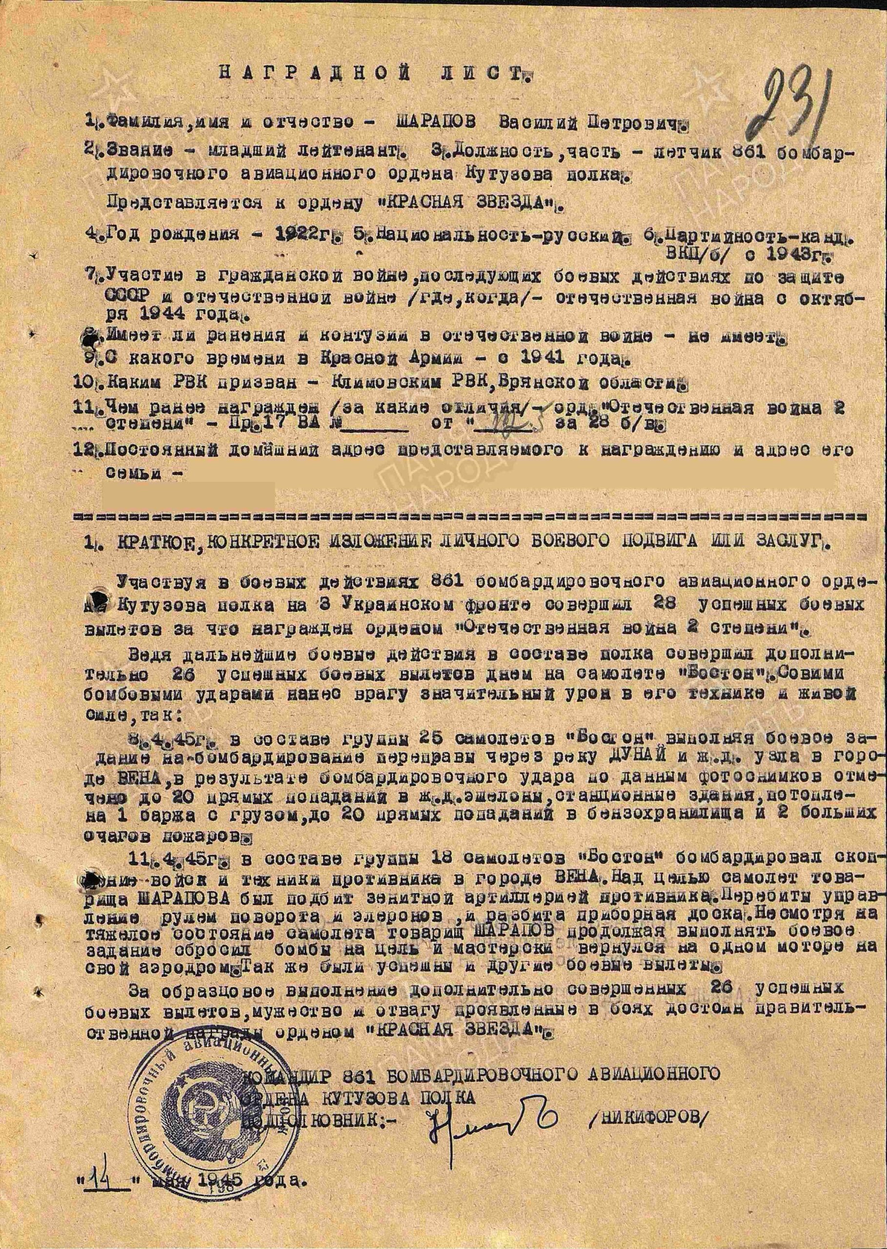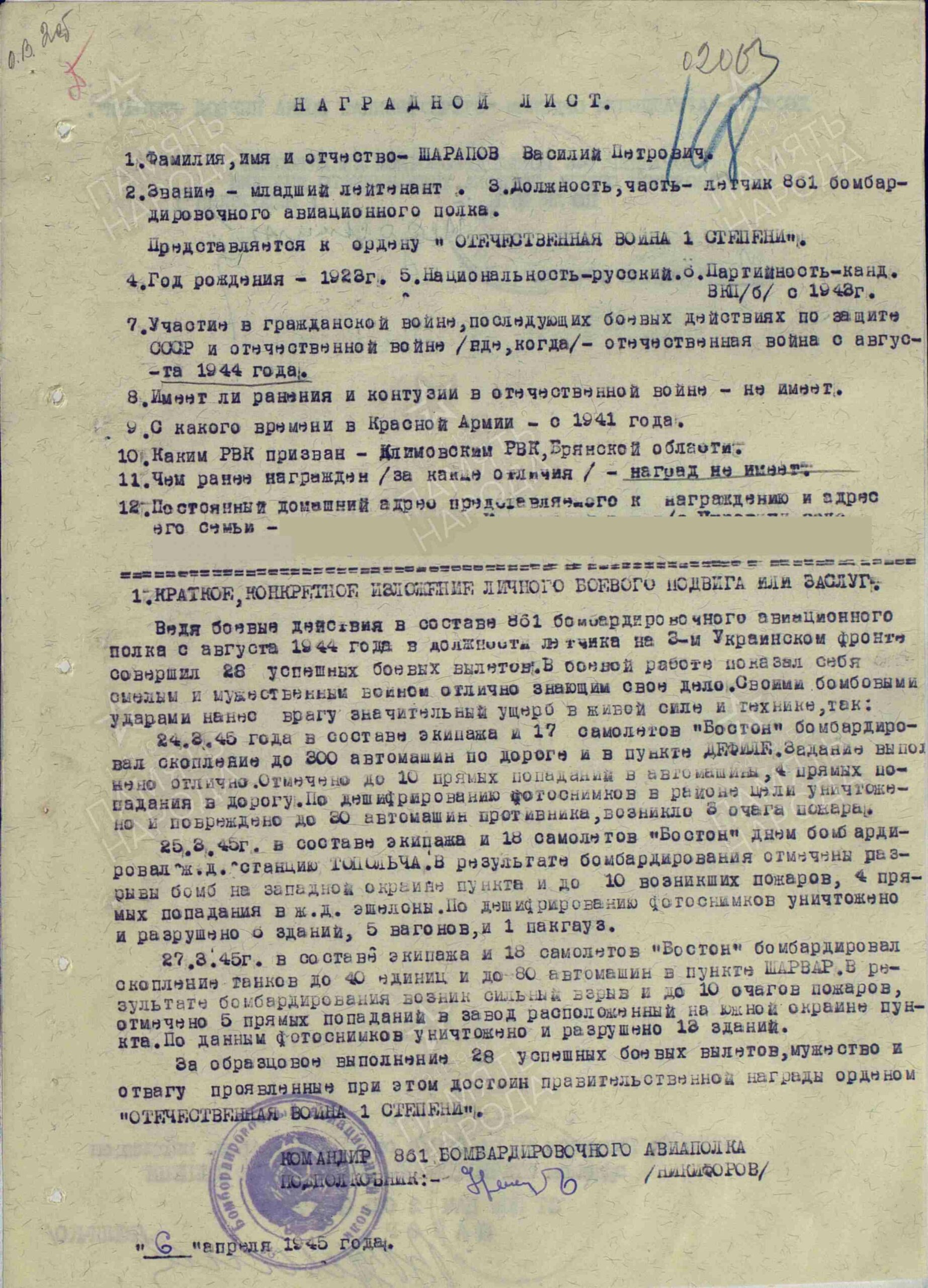 Документы говорят о том, что воевал Василий Шарапов в 861 бомбардировочном авиационном полку и совершил 87 боевых вылетов.