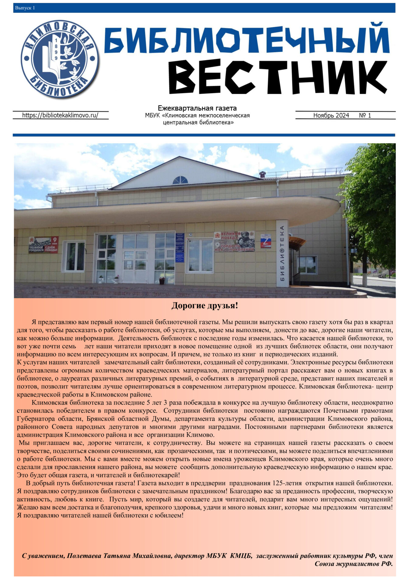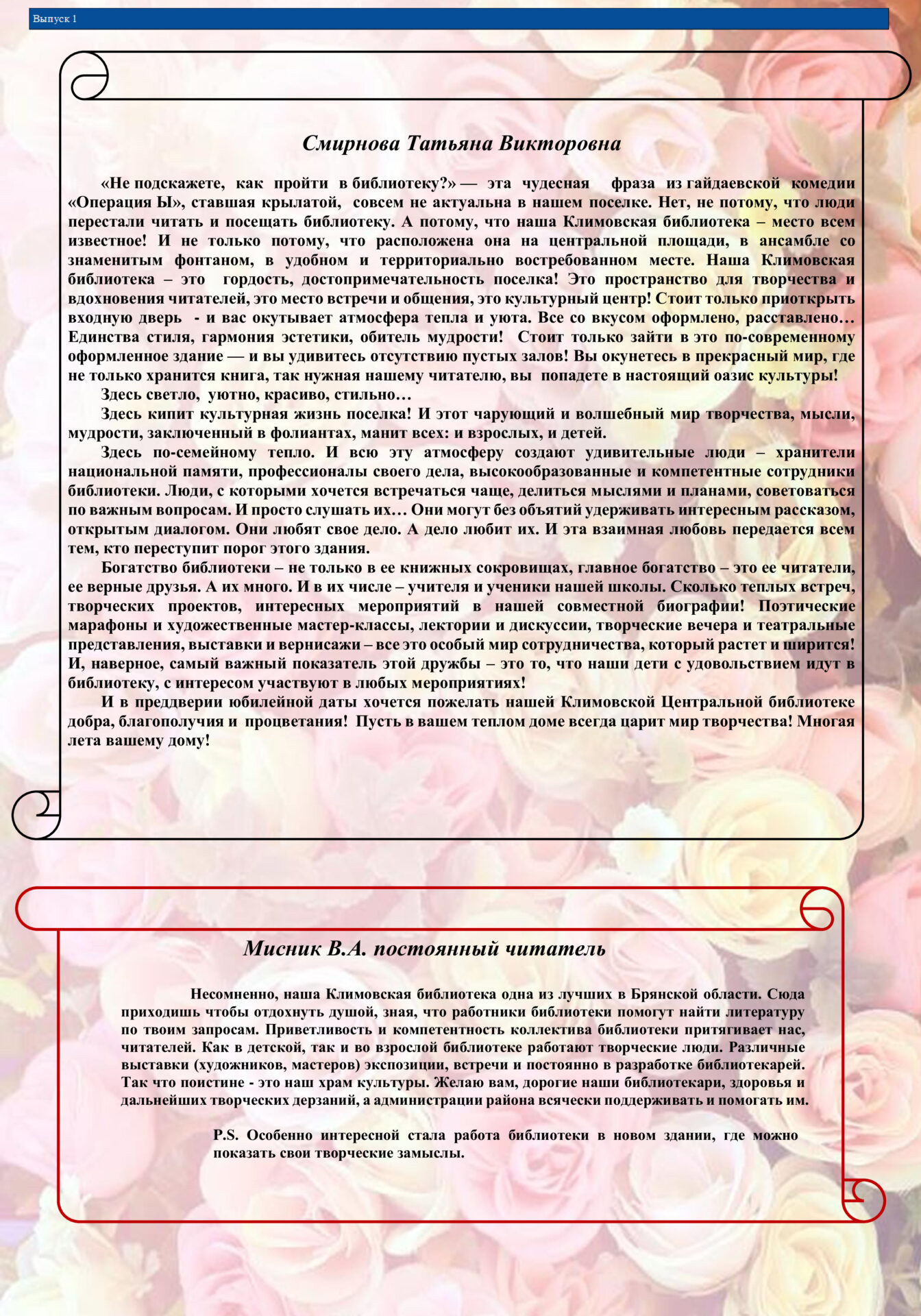 Муниципальное бюджетное учреждение культуры "Климовская межпоселенческая центральная библиотека" (МБУК "КМЦБ") 243040 Брянская обл., Климовский р-н, р.п. Климово, пл. Ленина,д.2; тел.:8(48347) 3-14-07; E-mail: biblioteka.klimovo@yandex.ru'